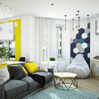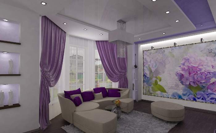 The zoning screen is made dense or purely symbolic - from the frame, with threads stretched over it, hand-woven in the style of macramé. The same goes for curtains. Separation using flooring also looks interesting: it can be two different colors of ceramic tiles, a combination of tiles and laminate, parquet and board, linoleum and painted fiberboard. When there is a children's or “sofa” zone in the bay window, they often put a carpet there, which is not acceptable for the working zone. Wall decoration with various materials is also very popular: a combination of wallpaper and decorative plasters, various types of paint and wall panels allows you to create an original design.