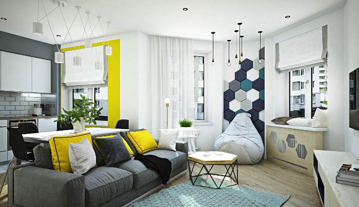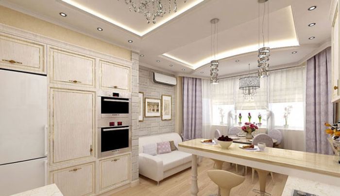 When planning a kitchen-living room with a bay window, professional designers recommend the following: