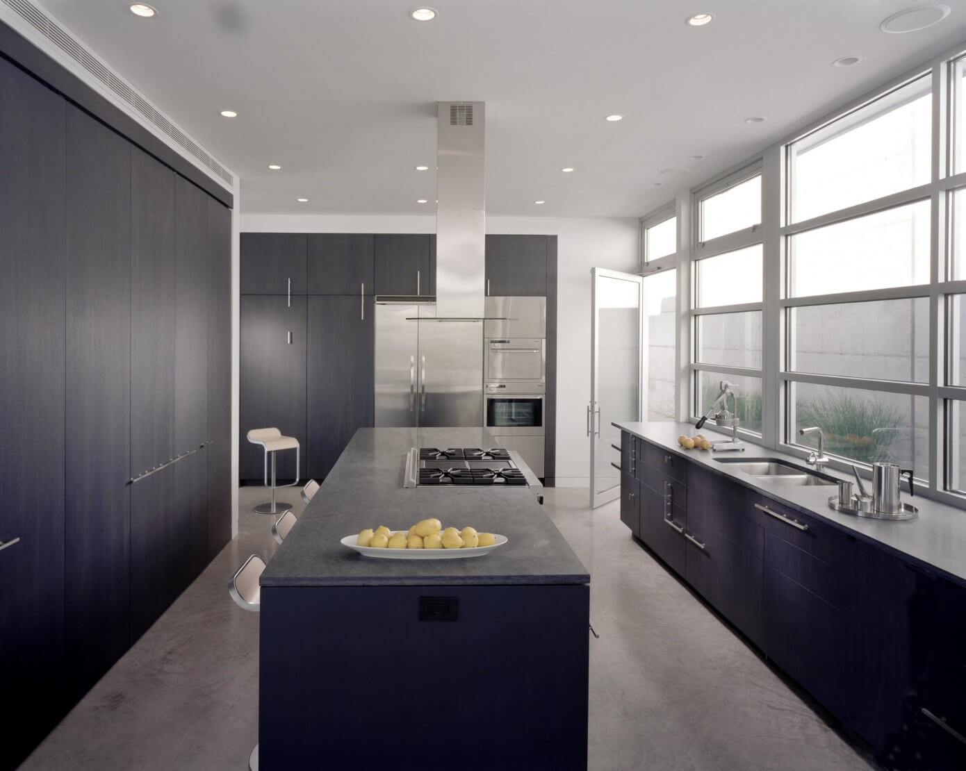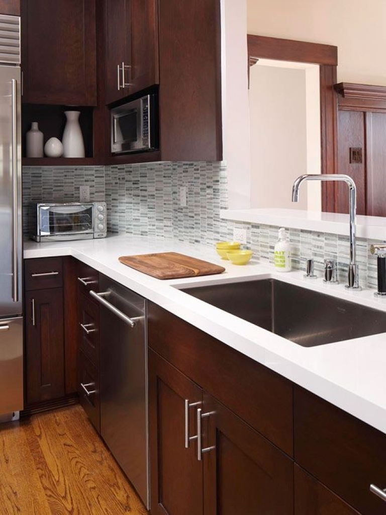 To kitchen didn't look gloomy headset designers are advised to install on a more lighted side. Natural sunlight will create a cozy atmosphere in indoors. With proper organization of space, dark furniture won't seem too bulky and heavy.