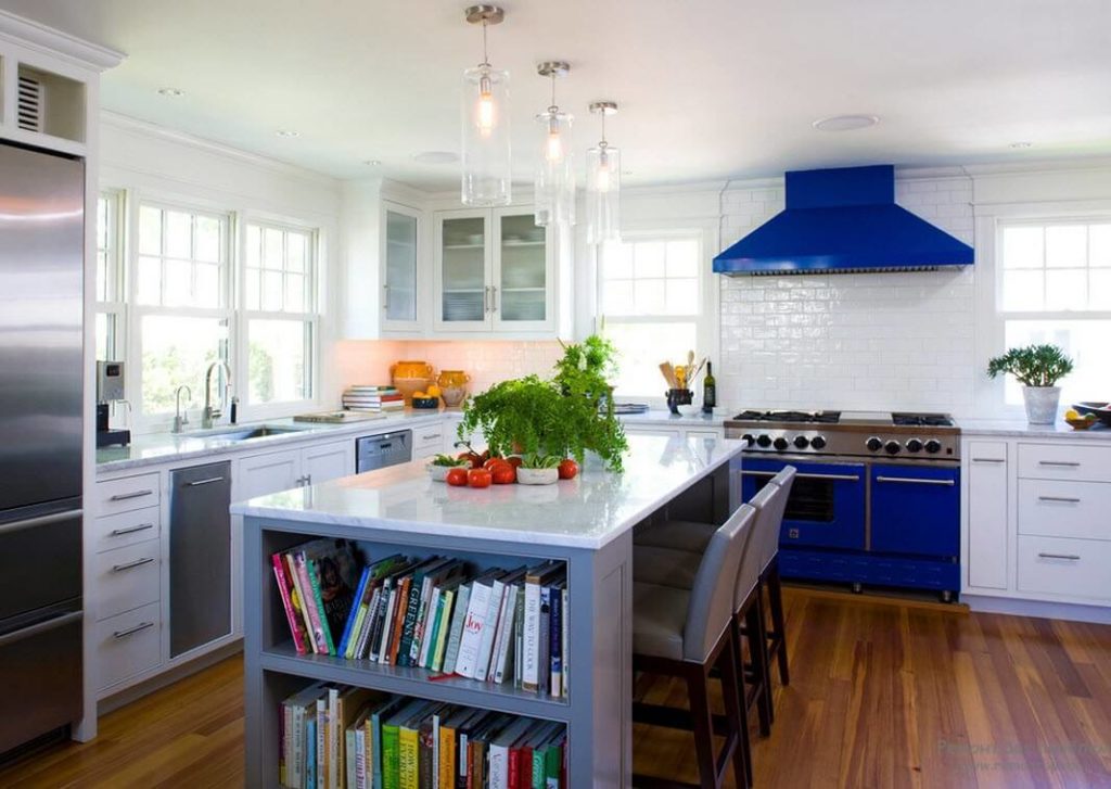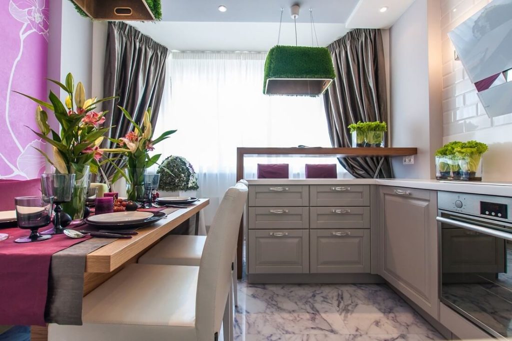 Before deciding exactly which one kitchen Design will need to get acquainted in detail with fashion trends. Currently, eco-style is becoming very popular. Mistresses arrange around the perimeter several house plants in pots. If the footage and financial situation allow, you can embed a flowerbed and a decorative pond in furniture.