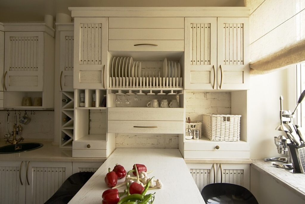 The Provence style is cozy and soft, ideal for decorating the kitchen. There are no bright and catchy elements, everything is kept in white, milky tones. Contrast spots can be, for example, black and brown, for example, a chandelier, a water tap.