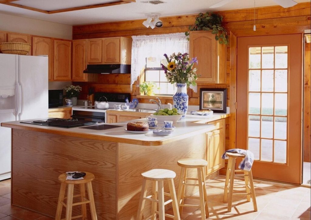 A kitchen in which the floor and walls are faced with wood. Currently, everyone wants to live among high-quality and natural material. Therefore, interiors in which there is a lot of wood are very popular.
