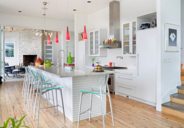- Visually connect kitchen areas and guest rooms using a variety of shades and textures. For example, the tone of the apron in the work area the kitchen combine with cushions for the sofa, the tone of the countertops - with the colors of the chairs.