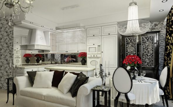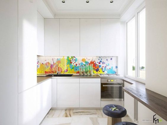 - Want to visually “hide” the kitchen and fix your eyes on the guest room? Get a discreet kitchen set with snow-white, white wood facades. An apron is also standard, in the color of the walls or kitchen cabinets. But in the guest rooms add more colorful elements. And vice versa: a set with colorful glossy facades balances the most neutral design of the guest room.