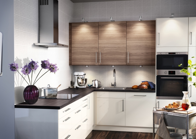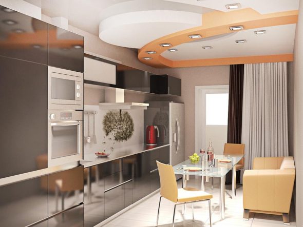 If the height of the wall cabinets is small, you can visually lower the ceiling by constructing a wall mounted drywall construction. Thus, the kitchen blends seamlessly with the rest of the interior. Household appliances, such as a refrigerator and an oven, should be built into tall cupboards, consisting of several tiers. In addition to electrical appliances, they will accommodate the bulk of the products: cereals and spices.