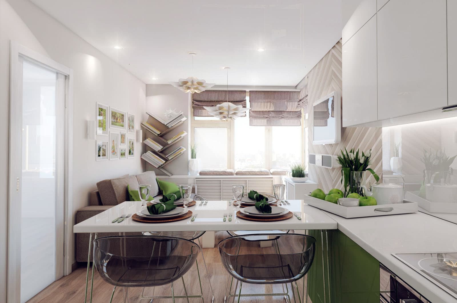 This is facilitated by laconic furniture and a minimum of massive elements.