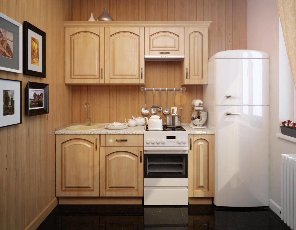 - 1 Small-sized kitchen design. Corner and direct headsets