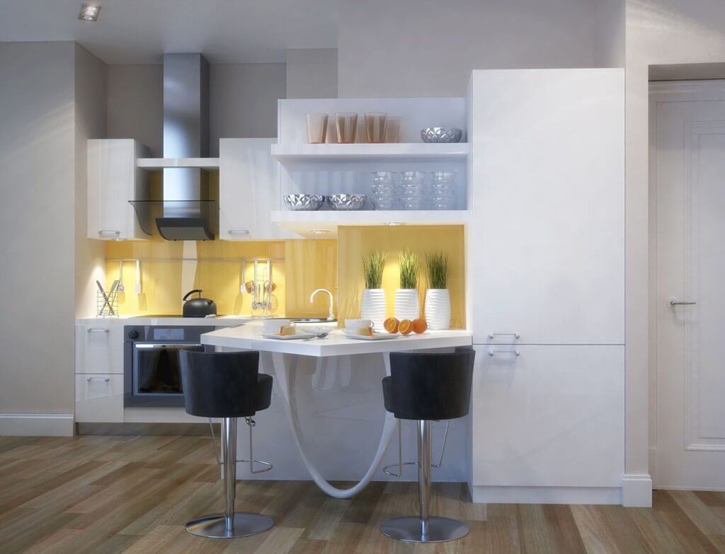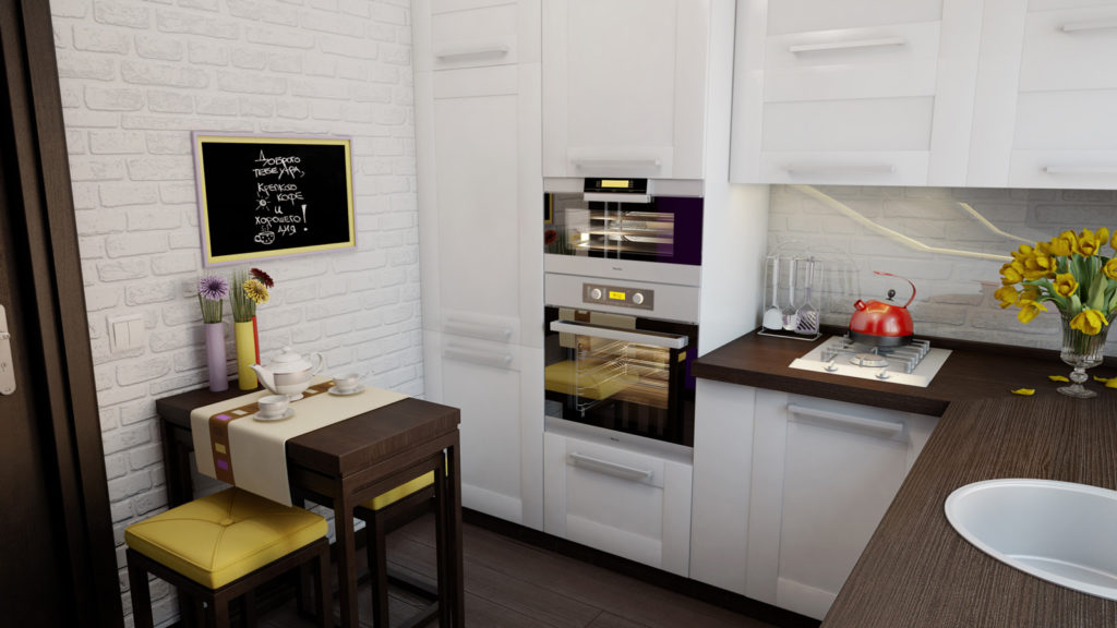 It is worth using the most suitable small-sized kitchen design. Minimum items, high functionality. A great option is minimalism or hi-tech. Both allow you to abandon everything unnecessary, using only important, more practical things.