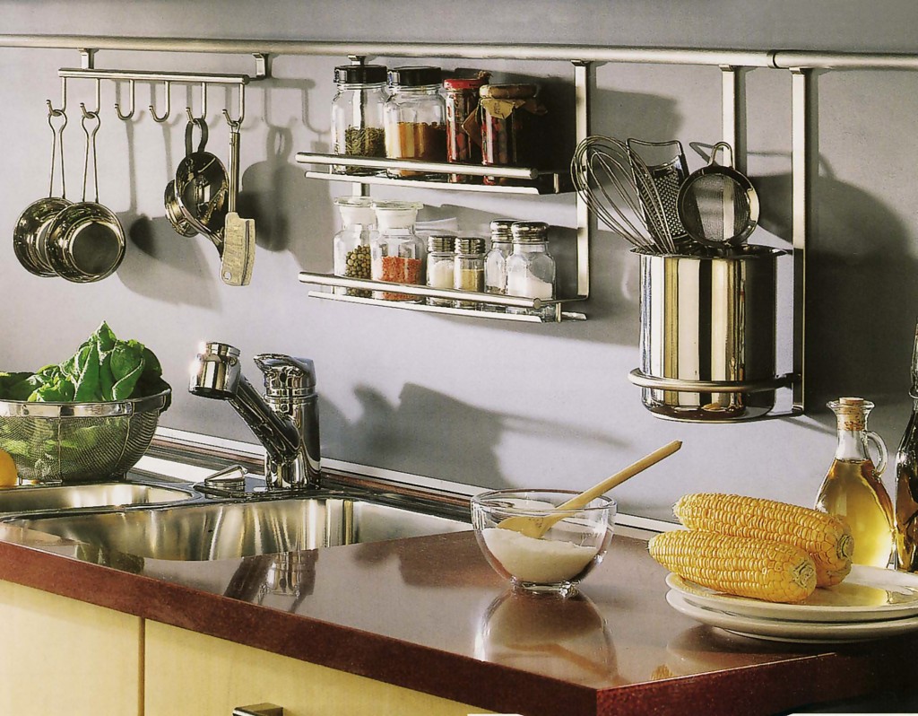 - Storage organization. You can replace standard cabinets with railing systems. They allow you to conveniently and practically use the available space.