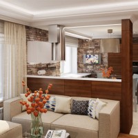 In such a design project, it is recommended to create a single space with a visual delimitation of the boundaries of the premises. It is not necessary to create capital partitions, it is enough to make arches, portable screens, sliding partitions, curtains from beads or threads. This will visually divide the room into zones.