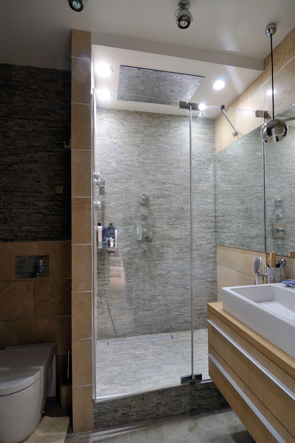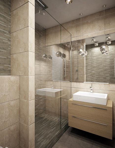 The bathroom is also that part of the house where experiments with color combinations are possible. A combination of two contrasting tiles or bright furniture against a gray tile will look very stylish.