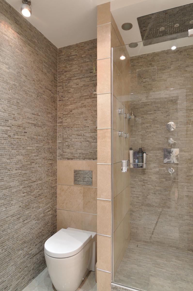The interior of the bathroom is made in tiles of two colors - white and gray