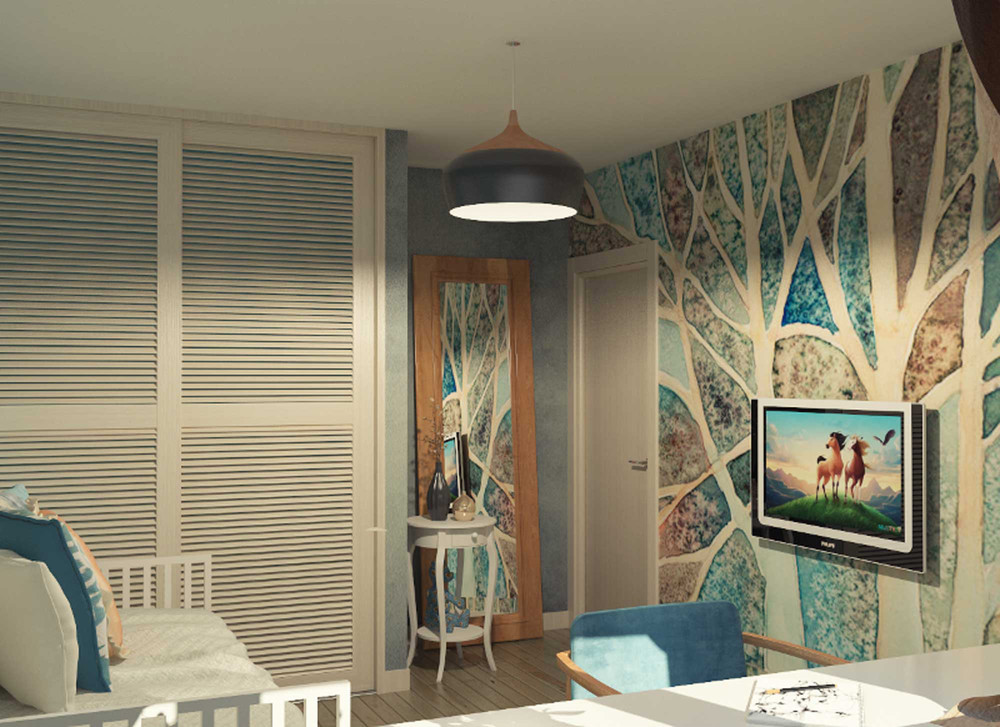 Layout for two: the apartment receives a bedroom, a living room, and a large wardrobe