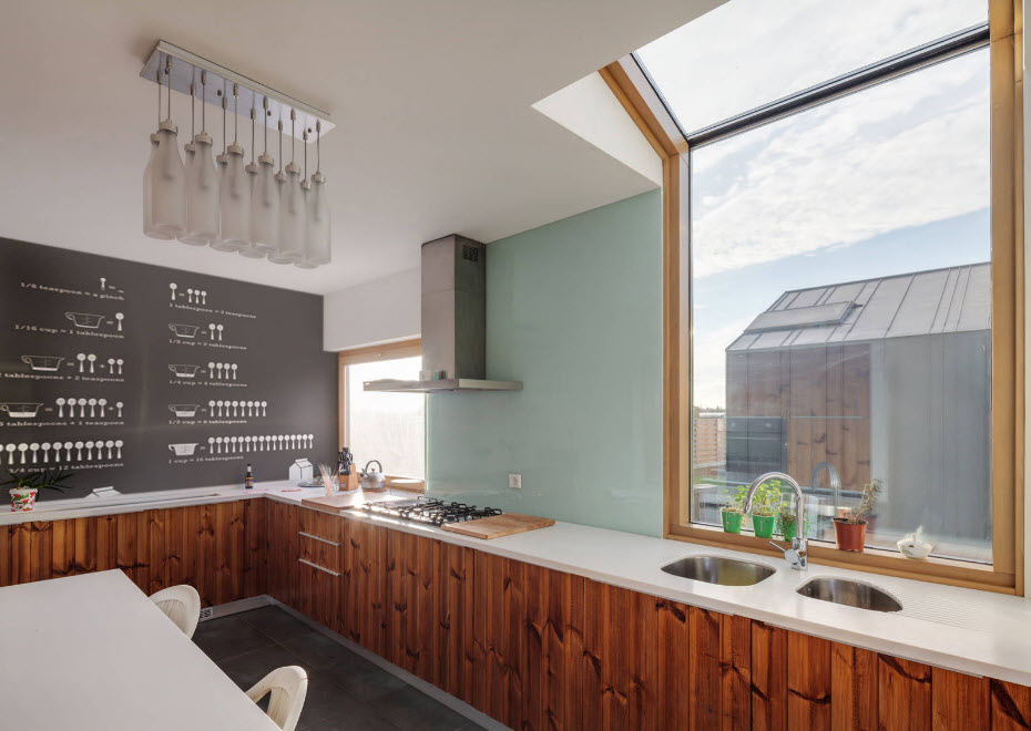 The cork panels look original and warm. Post hostess notes or recipes on the walls. Leave some cookbooks and books recommending healthy eating in the buffet. Make a series of hidden secret niches with all kinds of spices, pots and pans so that they do not occupy a significant place in sight. This will save free space in the kitchen and give more functionality when cooking culinary masterpieces.