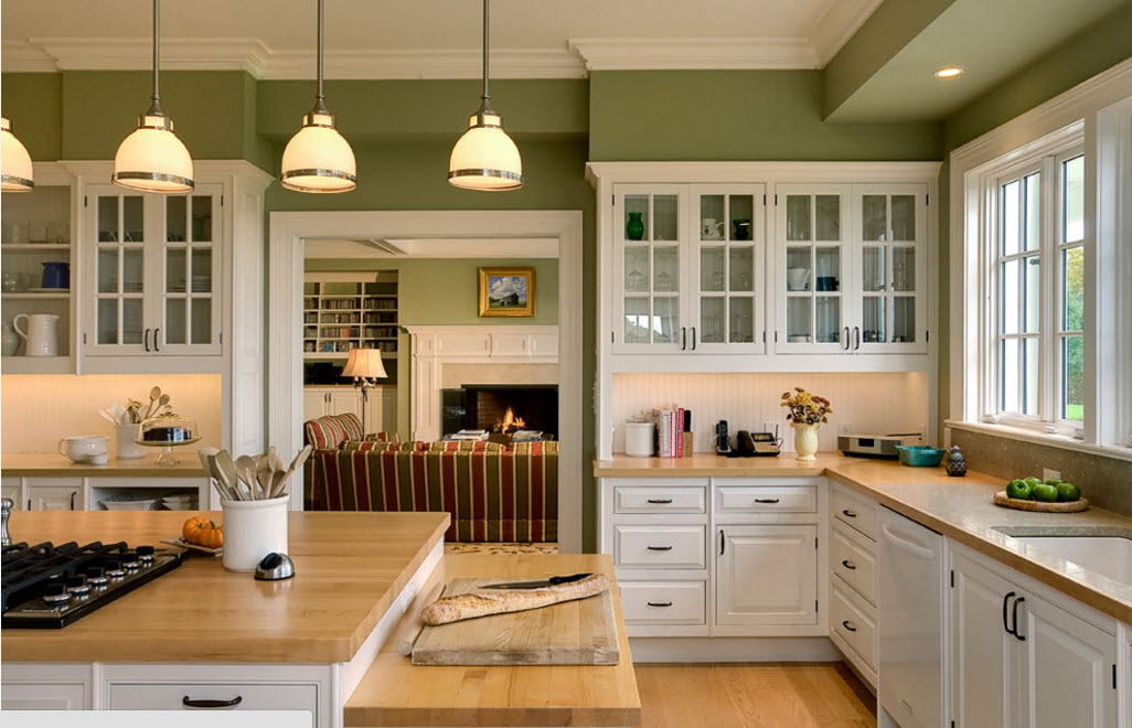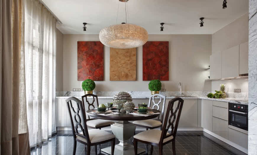 To create coziness, the area at the dining table can be decorated with paintings, shelves with various figures made of wood or ceramics. In the interior of the kitchen, this will add personality and originality. Some images can be selected so that they cause appetite. This can be handmade applications and the like unique things made by yourself or handmade by order.