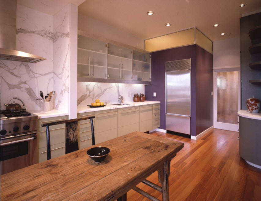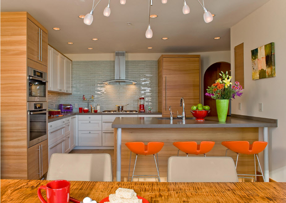 The kitchen looks very original with the use of PVC and MDF wall panels in decoration. Gives individuality to the wall panel, which distinguishes a large-scale section of the wall or the entire wall, depending on the theme and materials for the panel (shells, fabric, wood, etc.). Very successfully, the interior uses modular paintings that combine a common design style. It looks very stylish and modern.