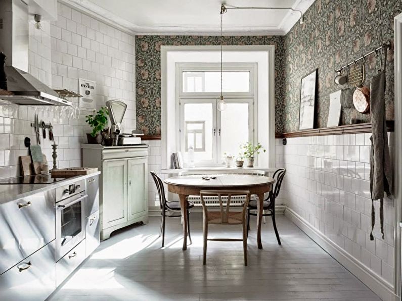 - For a small-sized kitchen - the walls should be as lighter as possible, and the color scheme should be combined with furniture. And the picture on the wallpaper - match the picture in the interior of the kitchen. The chosen design according to the country style presupposes the presence of a small pattern, the image of flowers, vegetables, fruits in combination with classic furniture and decor.