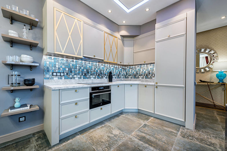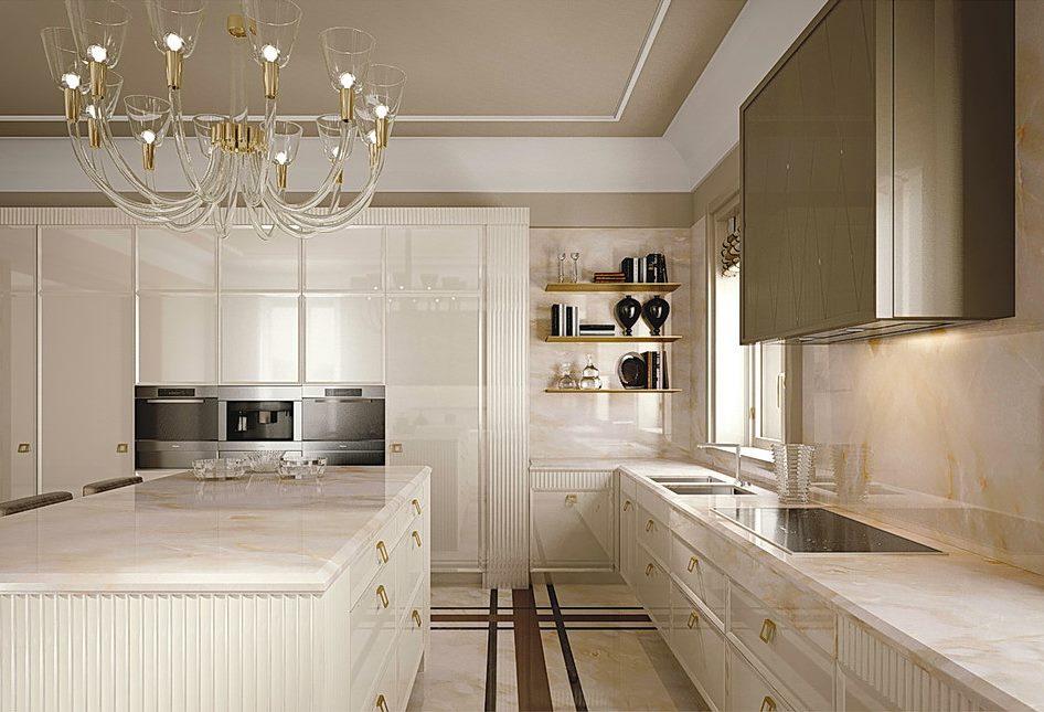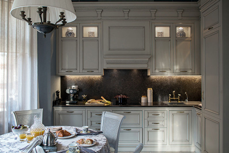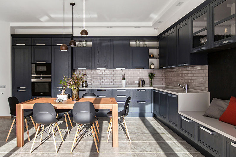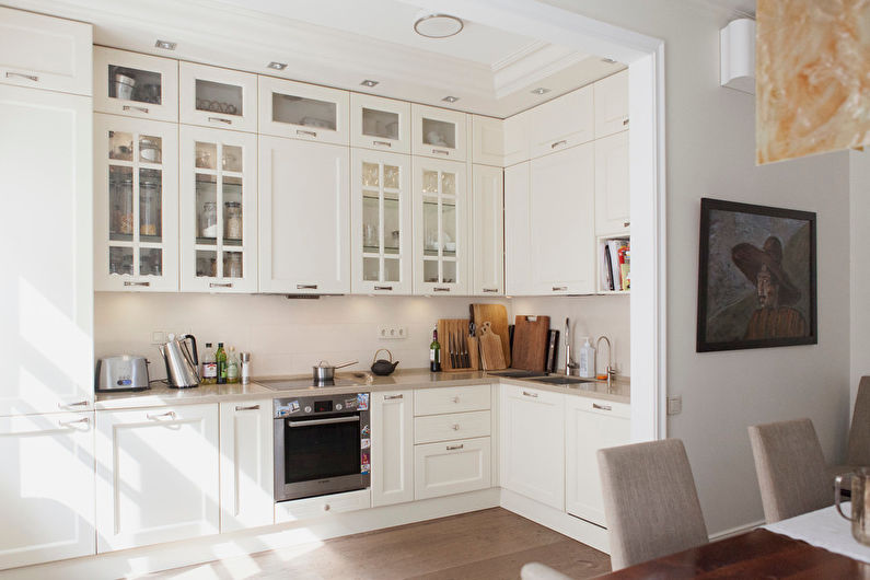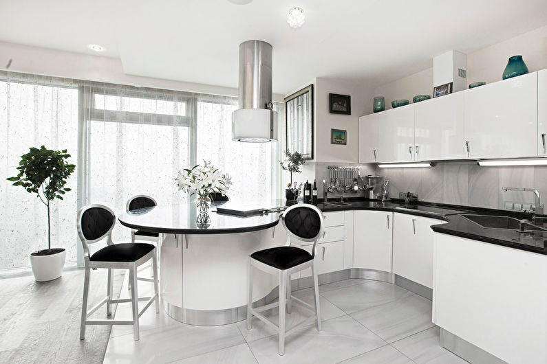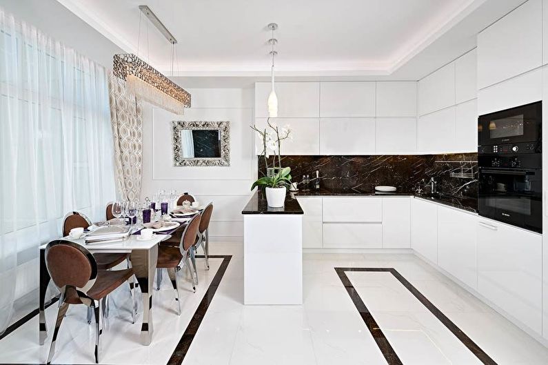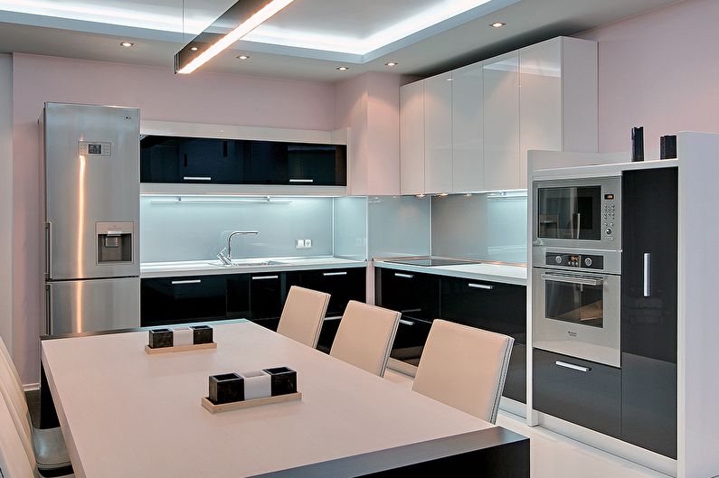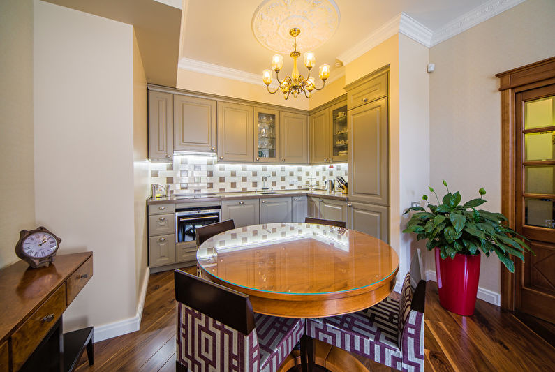 Corner kitchens in this style look chic. This applies to all elements.Saving money is not appropriate here. Luxury, brilliance of surfaces, facades, deliberate high cost - a full expression of this style. The room decorated by the “Classic Modern” is an attribute of a true modern aristocrat.