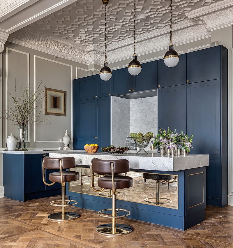 - The space decorated with the Art Nouveau style is perfectly complemented by a large aquarium located directly under the island countertop.