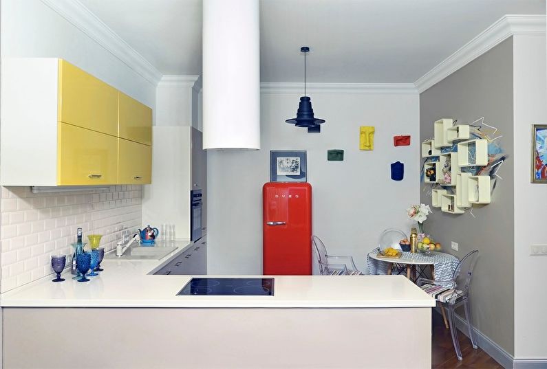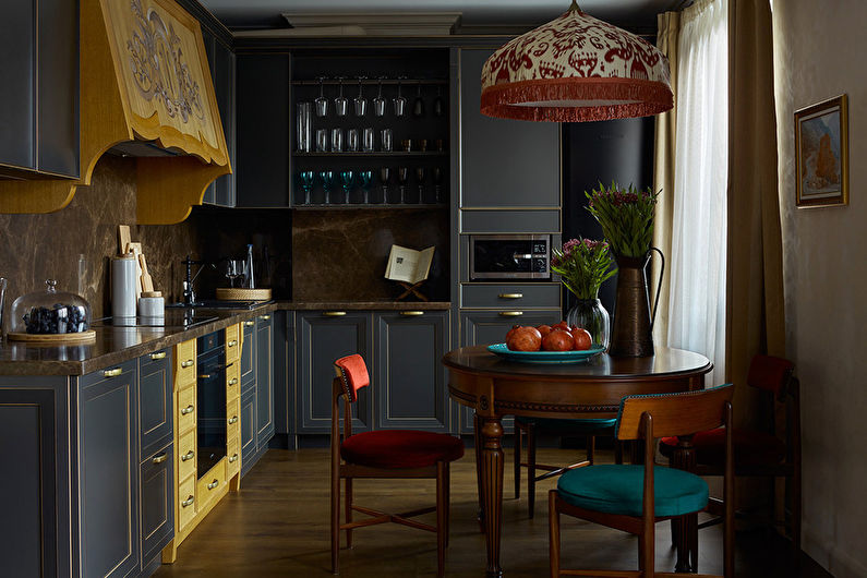 For such a design of a corner kitchen, contrasting accents are appropriate. For example, chairs and armchairs are selected in purple. If we are talking about a chair - solid plain textile, embroidered at the joints with silver rivets.
