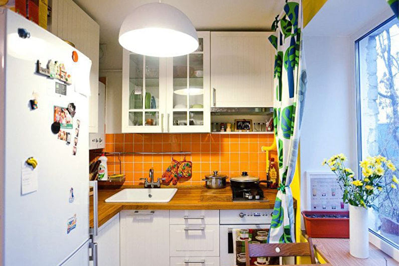 To increase the working area, use the windowsill as an additional countertop. This decision will bring unusualness to the interior of the room. But consider the presence of a heating battery under the window. If possible, it is better to transfer it to another wall. If major repairs are not planned, then the lower cabinets cannot be placed here.
