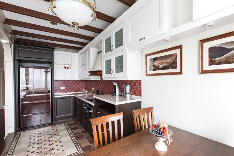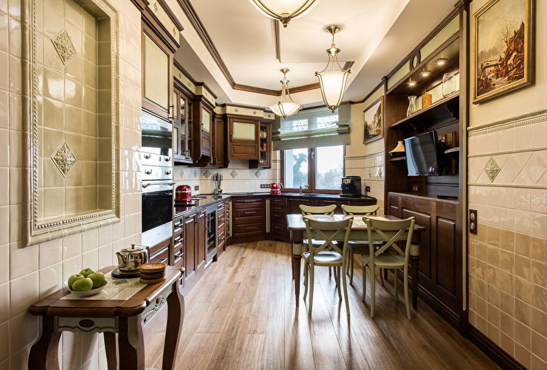 If desired, make a bar counter. It is installed above the kitchen worktop. The space under the bar is composed based on their functional purpose. In one case, it is decorated with a decorative zone. At the same time, "Classic Modern" accepts beautiful book covers, set on open shelves, or carelessly lying on them. If the dimensions of the corner kitchen are relatively small, it is better to make additional cupboards for dishes.