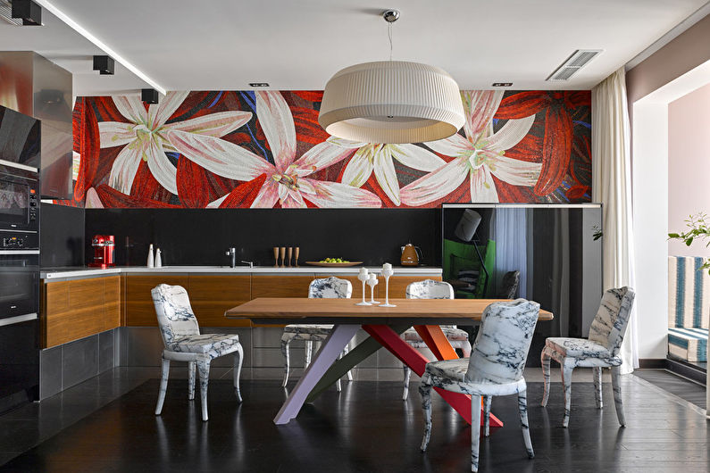 Dining area, or rather furniture for it, buy an unusual performance. Modern is a more modern direction. But the combination with "Classics" extols aristocratic notes. With regard to furniture - buy metal, chrome-plated chairs with wooden crossbars on the backs. The seat for this is white textile.