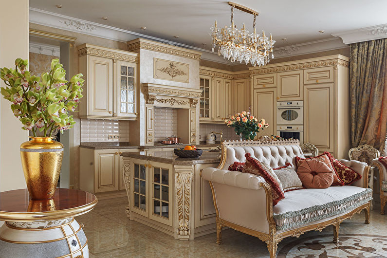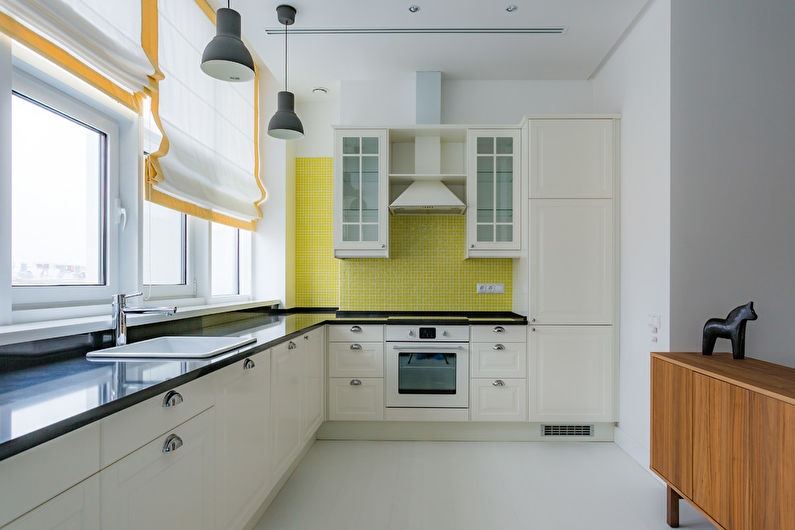 Kitchen apron - the canvas of the artist. With this attitude towards decoration, you will get a truly royal room for cooking. Ceramic tiles of small sizes are best suited here. The pattern is chosen floral, but not bright. The yellow hue will fit perfectly into the interior of the "Classic Art Nouveau".