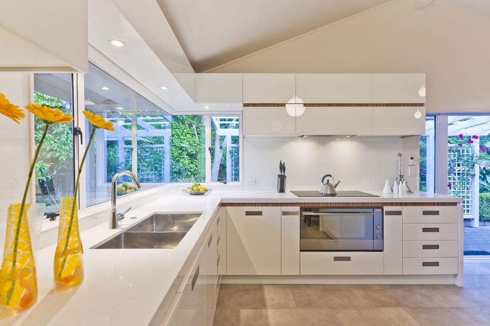 The sink is most conveniently placed in the corner of the room. It takes up a lot of space, but here it will be possible to compensate for such a drawback. In this case, you need to correctly equip the corner cabinet both under the countertop and above it. It will be inconvenient to operate the far corner, so order headsets with extendable shelves for dishes. It is also quite possible to install a washing machine or dishwasher here.