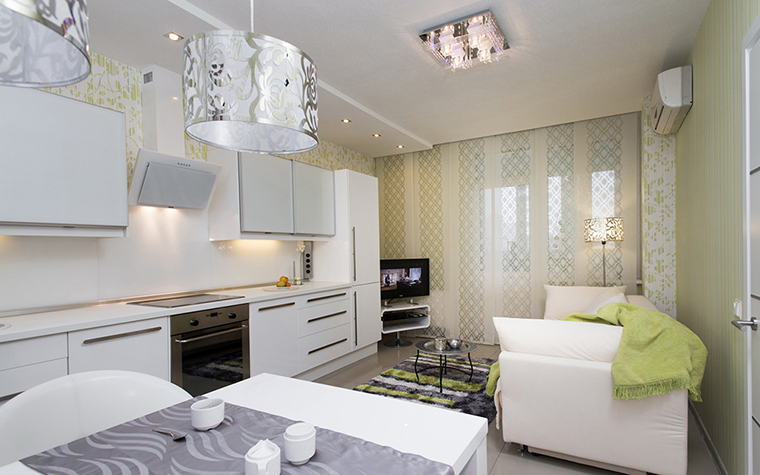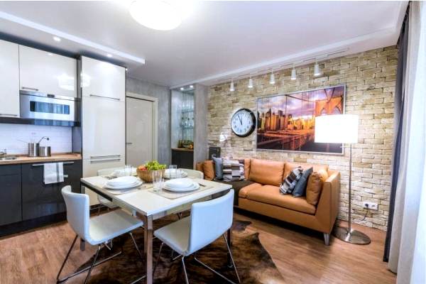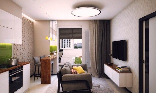 An interesting idea for such accommodation would be combining the kitchen with the loggia and moving the recreation area there. Such a solution will definitely make the kitchen spacious, and most importantly interesting for many who come to visit.