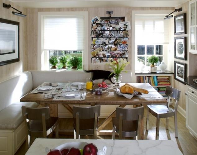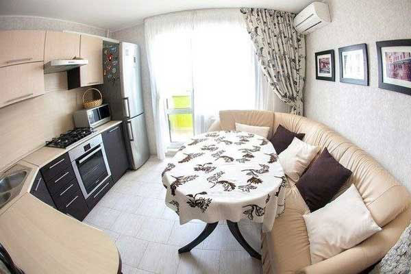 Installing a soft sofa, and, consequently, a sitting area by the window is an interesting option. However, it is not suitable for everyone, usually the windows on the kitchen are located in the middle of the wall. This means that the recreation area will be located right in the center of the room, which is not particularly convenient if the kitchen is not gigantic in size, and the work surface is at your side. Therefore, this option is suitable only for spacious rooms.