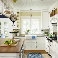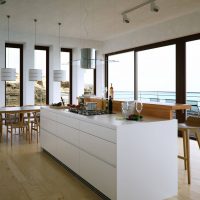 - Central. For zoning, the space is located in the center of the kitchen and divides it into a dining and working area