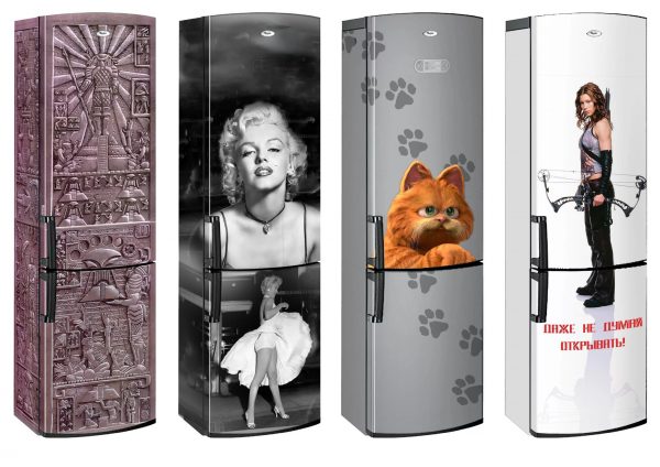 Today it is considered fashionable to paint household appliances with crayons or slate paint. Many decorate the refrigerator with vinyl stickers, magnetic panels with photo printing, carved details, self-adhesive film, etc.