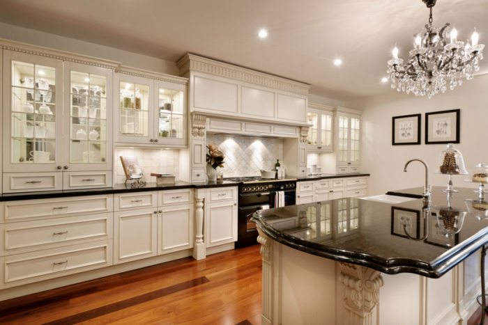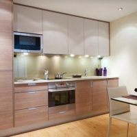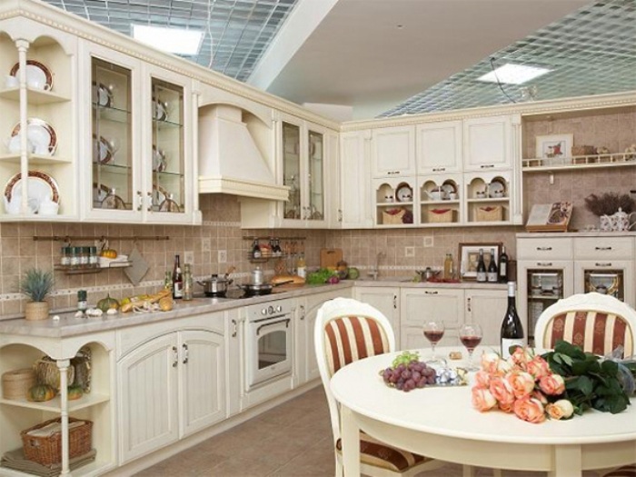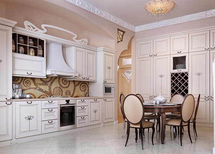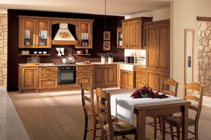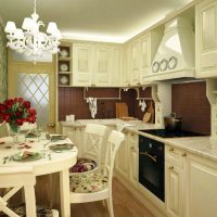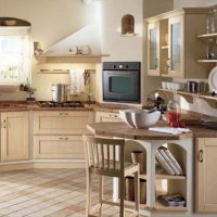 In this style, light-colored furniture is installed using the decor of darker countertops made of natural materials: wood and stone will always be in fashion. The overall design of the room implies a large bright room with small color accents in the form of an apron at the work surface, combined in the same style with a table in the dining area. Linoleum on the floor, stylized as a tree, will look good - all materials for decoration should be natural.