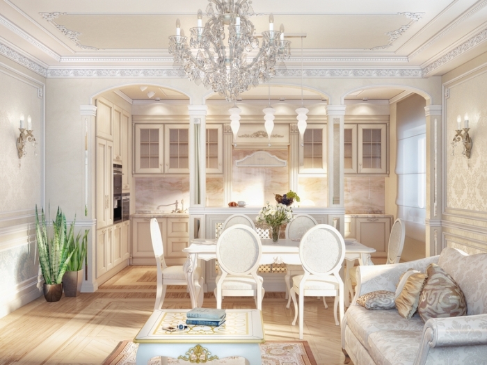 The adherence of the classics to straight strict lines in the arrangement of furniture and decoration of the floor and walls allows you to apply this style in any room.