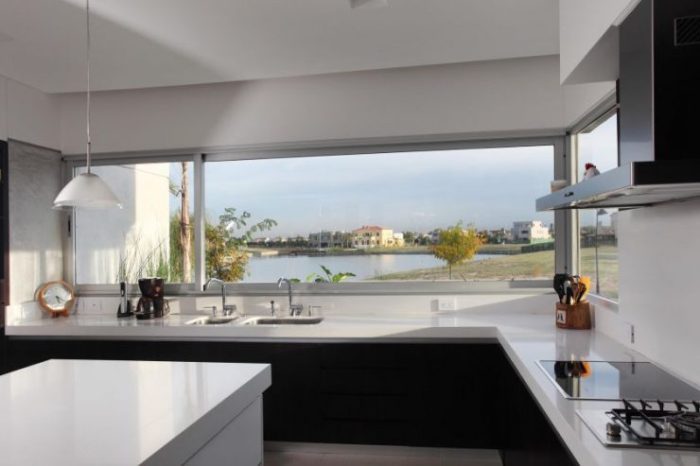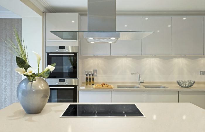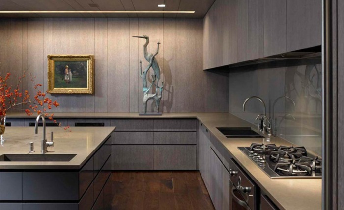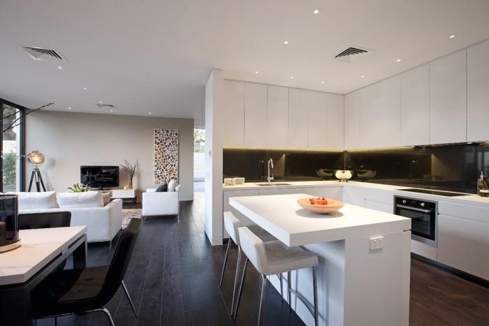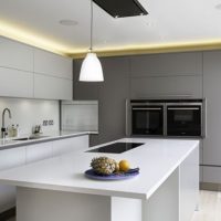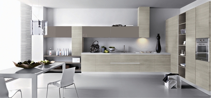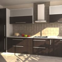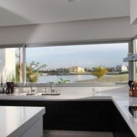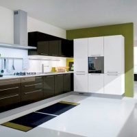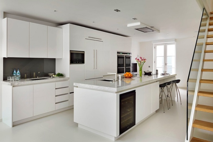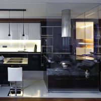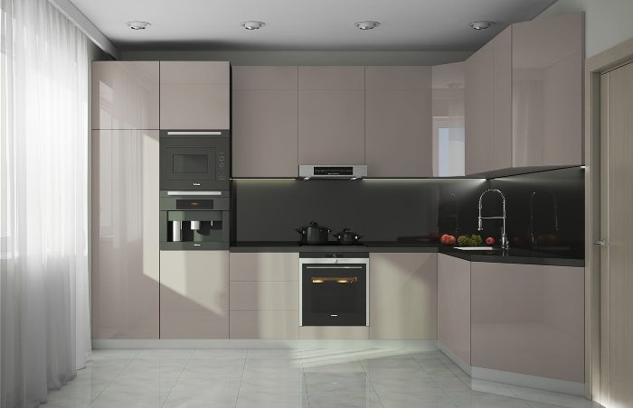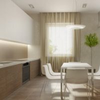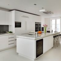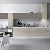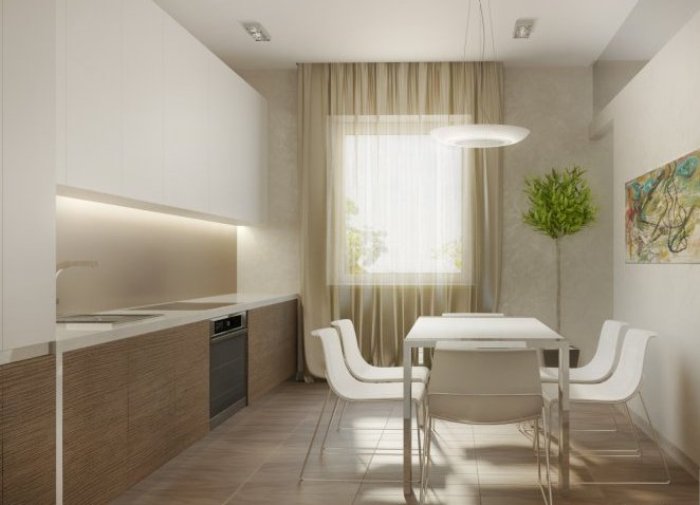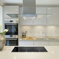 The design is carried out in one or a maximum of two colors of the kitchen set with built-in appliances to the tone of the furniture. To create this style, choose combinations of white, black, gray and beige colors with a glossy texture. Finishing floors and walls to match the furniture. Maximum illumination of a space with open windows, on which blinds are often hung instead of curtains.