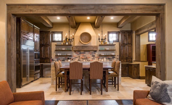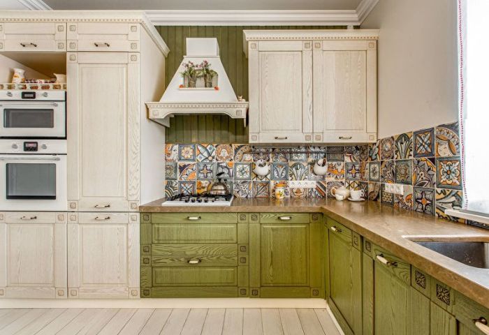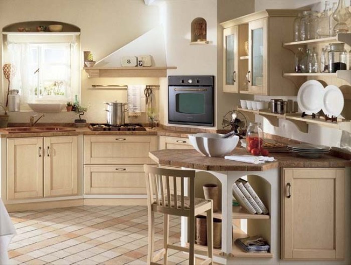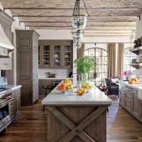 Decide which "village" will reign in your kitchen: Russian, French, English or American - each has its own flavor. The main thing in this interior is everything natural: wood, stone and brick in the decoration of the room, the natural colors of the wallpaper with natural motifs or a cage.