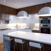 The bar counter in the modern kitchen is now very relevant. With the help of such a rack you can divide a large room into zones and add an additional surface to the interior for an easy snack or meeting with friends. In a large room, this corner can be used as a separate zone, which you can design in the design of the kitchen set, dining area or make a separate additional emphasis in the room. The bar counter must be in harmony with the rest of the furniture in the room.