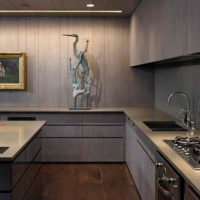 - the texture and finish of the wood floor should be organic with a common design, add an apron in the working area in the general style;