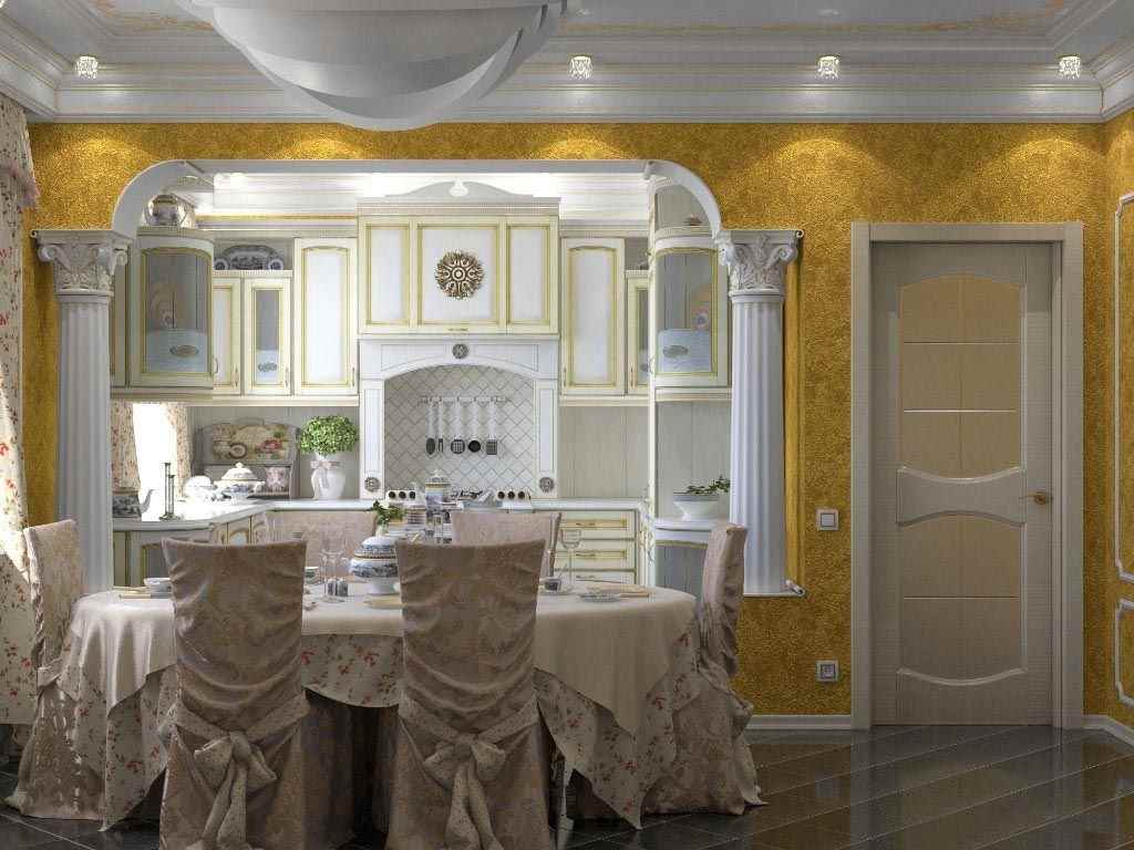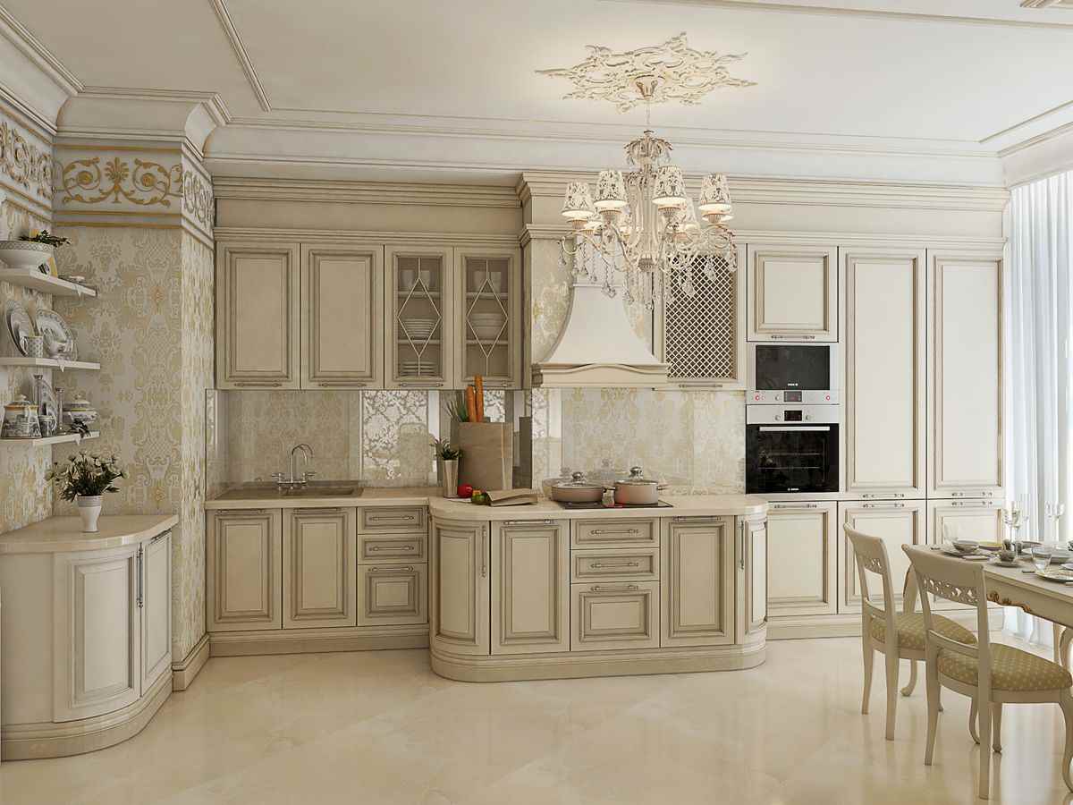 The housing of rich people in the XVII-XVIII centuries, when the interior classic was born, was distinguished by pomp, elegance and spaciousness. Therefore, most often, designers agree to create a classic kitchen in vast spaces with an area of at least 15 sq.m. and high ceilings (2.9-3.5 meters). Such parameters allow you to comfortably combine the cooking area with the dining corner (dining room). But, thanks to the light colors that prevail in this style subspecies, you can transform a small room.