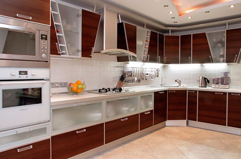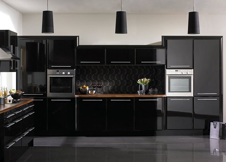 For facades, special films or enamels, glossy or matte, are used. An important nuance is the availability of places for built-in appliances. When decorating a furniture facade in modern style light milling can be used.