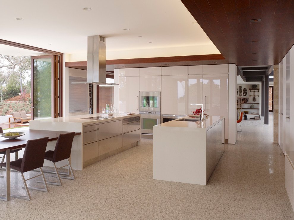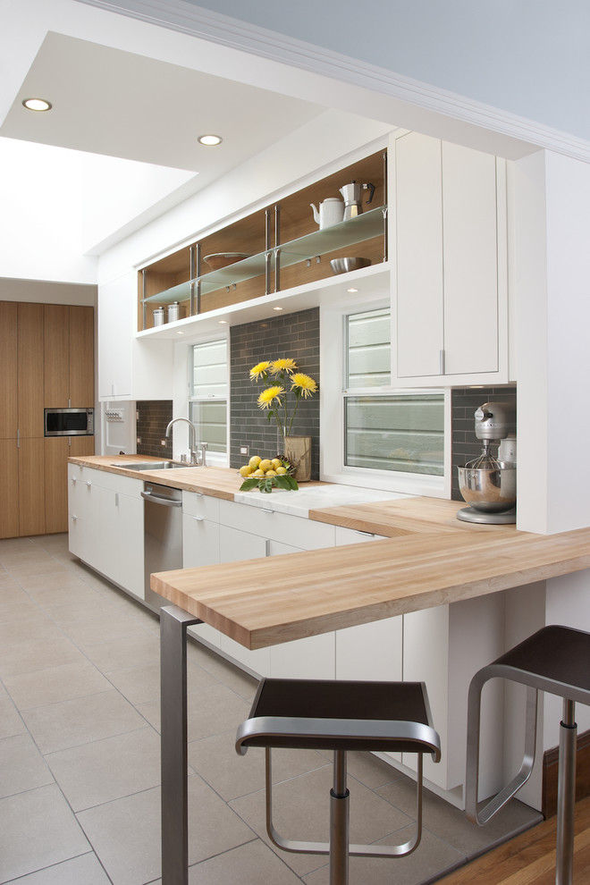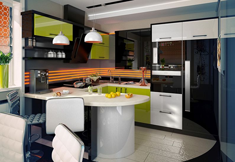 In more spacious kitchens at modern style it is free, you can apply the u-shaped arrangement. Smooth transitions, sharp and semi-sharp constructions may be present here. Choosing such a layout, you should carefully approach the general quadrature, given that furniture will occupy three walls at once. In order to correctly assess the possibilities, you should create a template kitchensstudios with a complete repair and calculate the free space between parallel rows. For a comfortable pastime, at least 1.5 meters will become optimal.