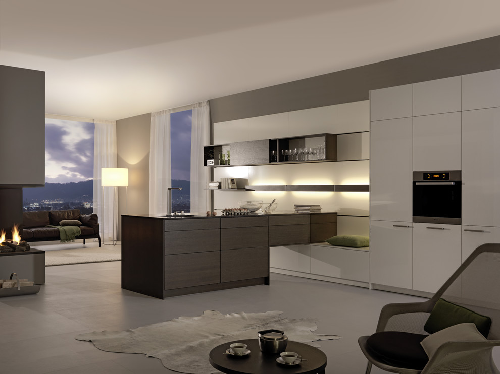 It is not limited to one ceiling chandelier. Additionally, fixtures are built in over the work surface, in the walls or even in the floor. Often lighting devices perform the function of zoning the room.