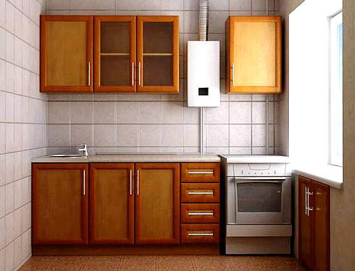 If it is located above the corner sink, it can be hidden behind a hinged housing module located on adjacent walls. The floor speaker is hiding in the lower racks, and the chimney is brought out into the street. In this case, the distance between the gas device and the meters should not be less than 1.5 m.