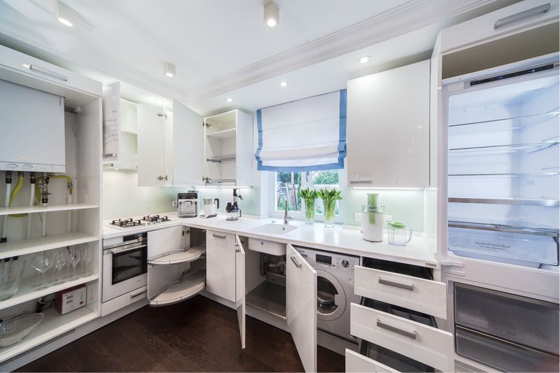 It is reasonable to use the U-shaped layout with a room width of at least 2.5 m, with smaller sizes the working area will be simply cramped and uncomfortable