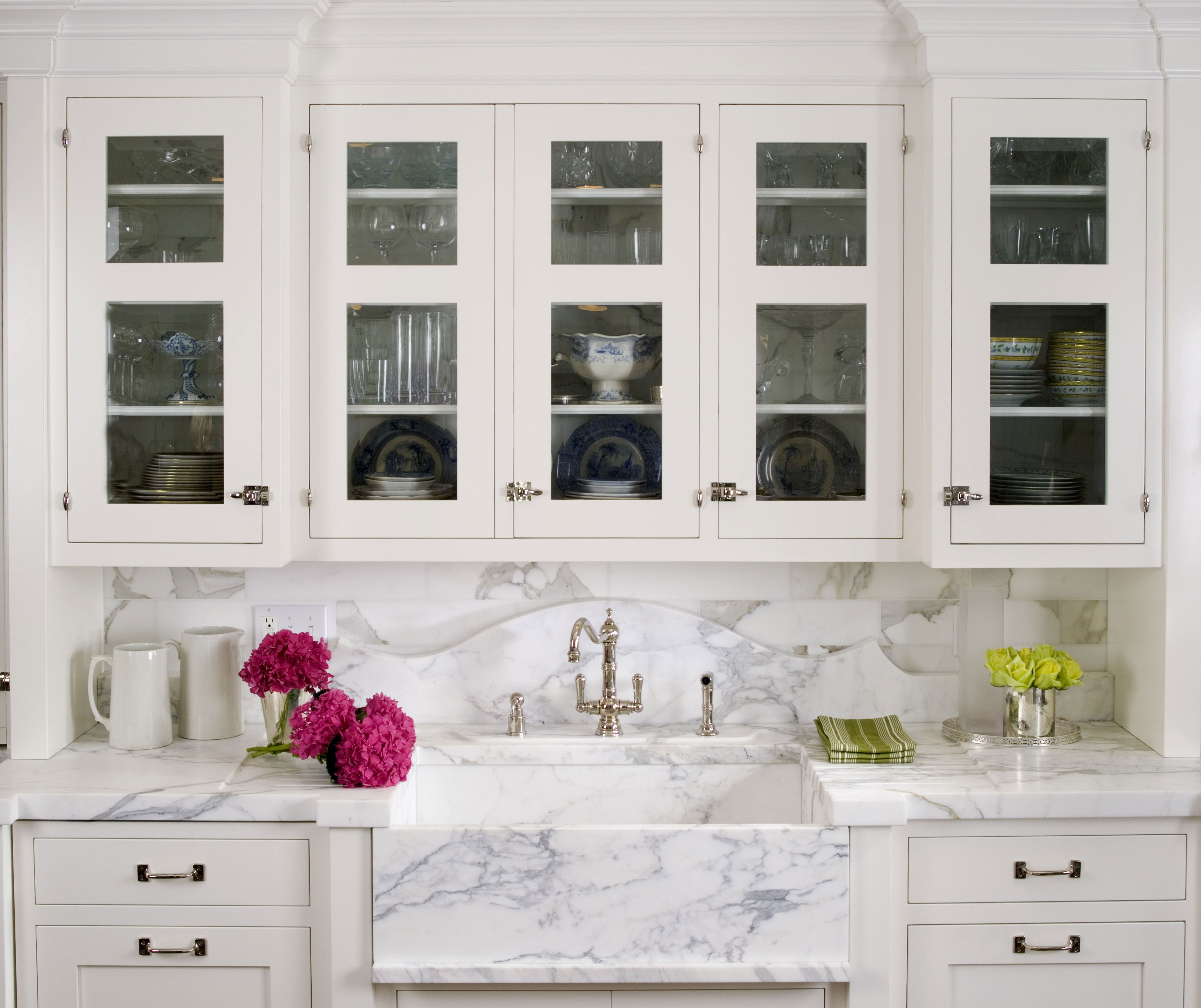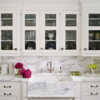 For furniture I often use tables with glass countertops. In this case, the cabinets are installed in frosted glass. The primary colors used are shades of white and gray, a mixture of white, gray and black, very often you can find decoration in gray with black splashes.