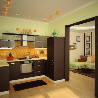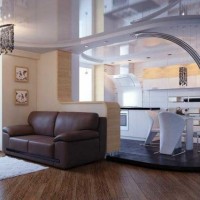 The design operates on the principle of a compartment, which, if necessary, will make the room even more functional. The kitchen is easily separated from the living room or become one with it the method of sliding the leaves.