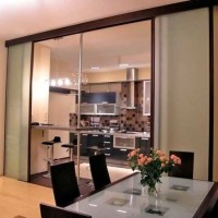 For people who want to diversify the room with a kitchen partition and at the same time do not want to install a stationary wall of heavy-duty materials, it is proposed to install a sliding partition as a room division.