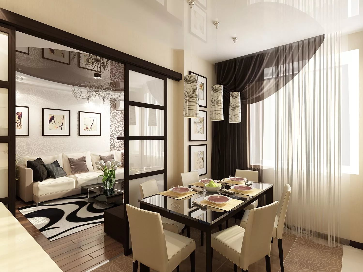 As a way to distinguish between zones, you can choose an elegant screen or a decorative partition.