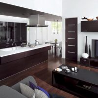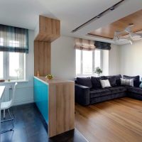 In order to additionally zone the room visually, it is recommended to choose different flooring for the kitchen and living room. For example, ceramics and parquet, porcelain stoneware and laminate. Not necessarily the coatings should match in color, but they should be in the same style.